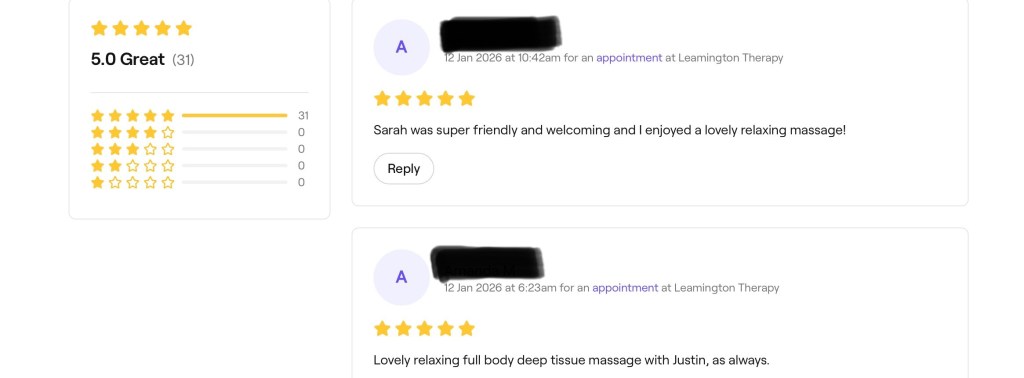 “I loved the hand massage part and the lower back massage in particular, but all was very nice and relaxing! A lovely experience! Will definitely want to come back!”